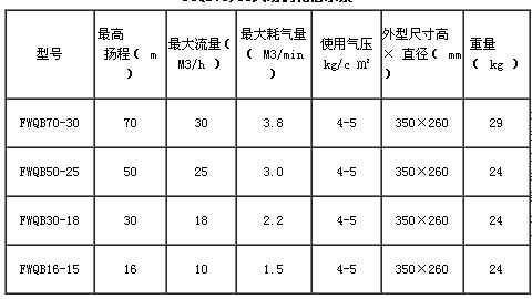 二、FWQB70-30風動渦輪潛水泵特點 1、無級調速。只要控制節流閥開啟程序,即控制氣體流量,就可以實現無級調速。 2、使用可靠,經久耐用,不受溫度及震動的影響,安裝、操作、簡單。 3、設有消音裝置,噪音小,維修方便,易損件小。 4、風動渦輪潛水泵具有較高的起動力矩和幾乎瞬時升到全速工作的能力。 5、適應能力強。適應于排放清水、濁水(泥漿、泥砂、煤渣水),重量輕。