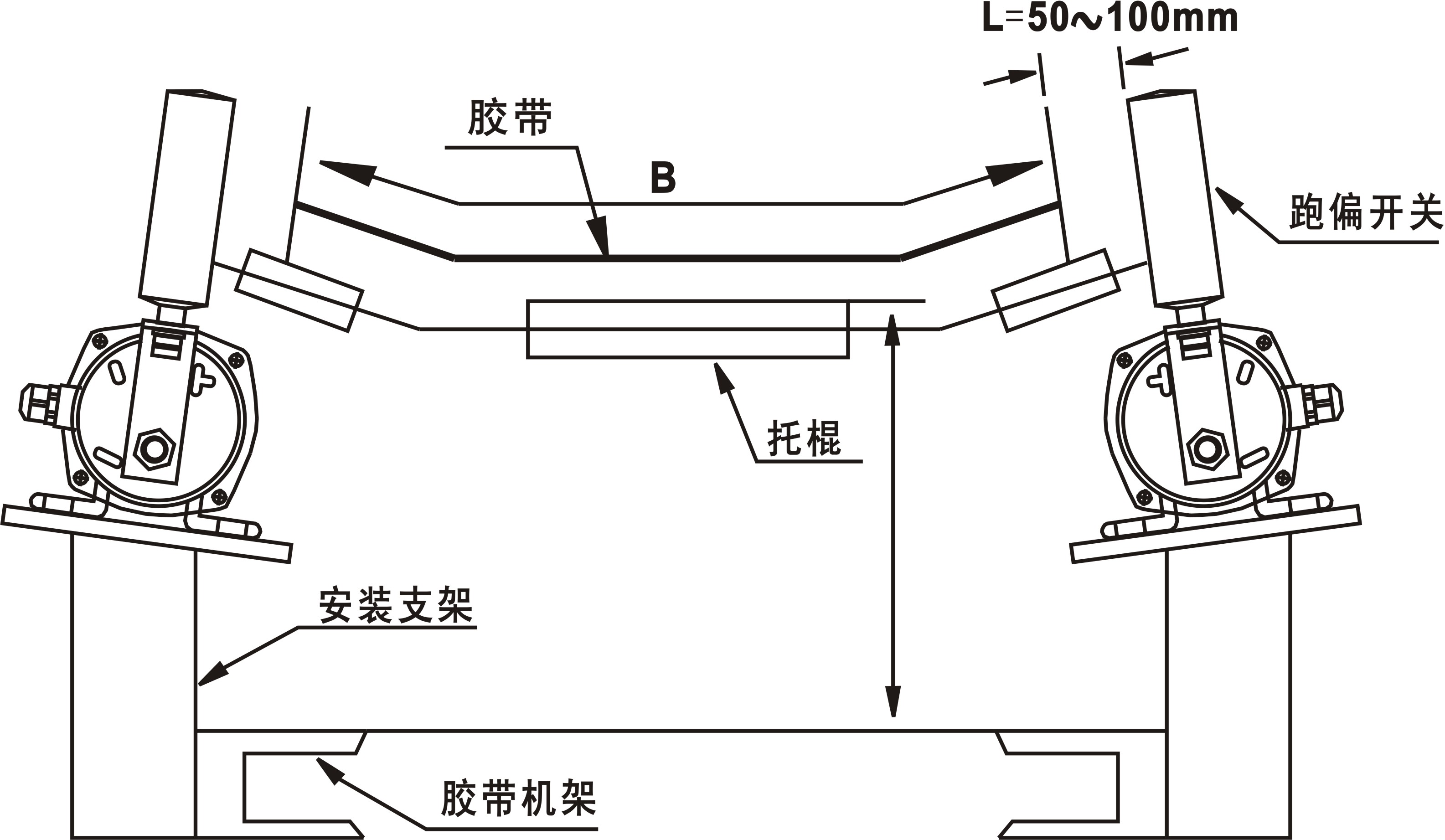4.跑偏開關應通過安裝支架與輸送機中間架連接,開關支架應在輸送機安裝完成后與輸送機機架焊接,跑偏開關與跑偏開關支架用螺栓固定。